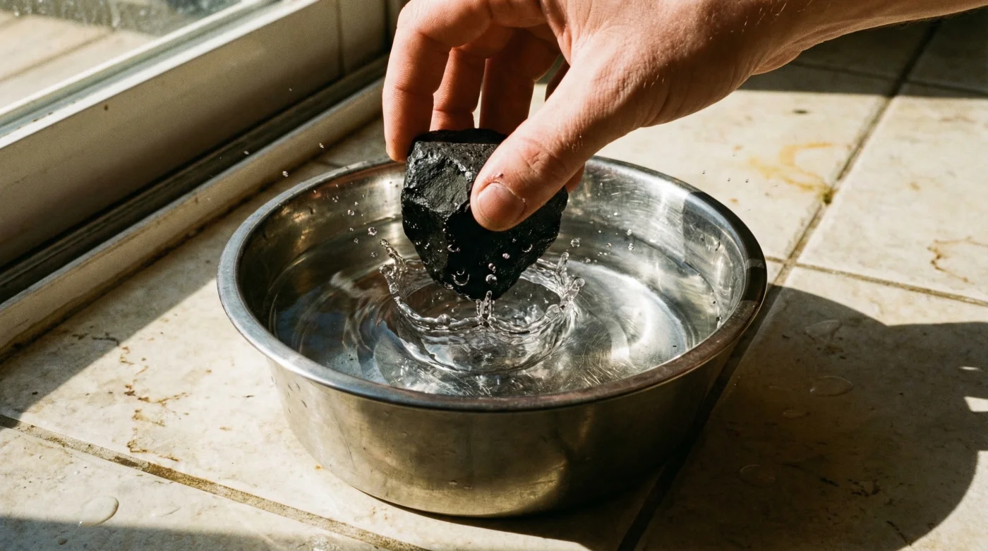 • Step 1: The Initial Rinse. Vigorously rinse the raw stones under cold, filtered water for 5 minutes to remove the fine, black carbon dust (shungite residue) leftover from mining.