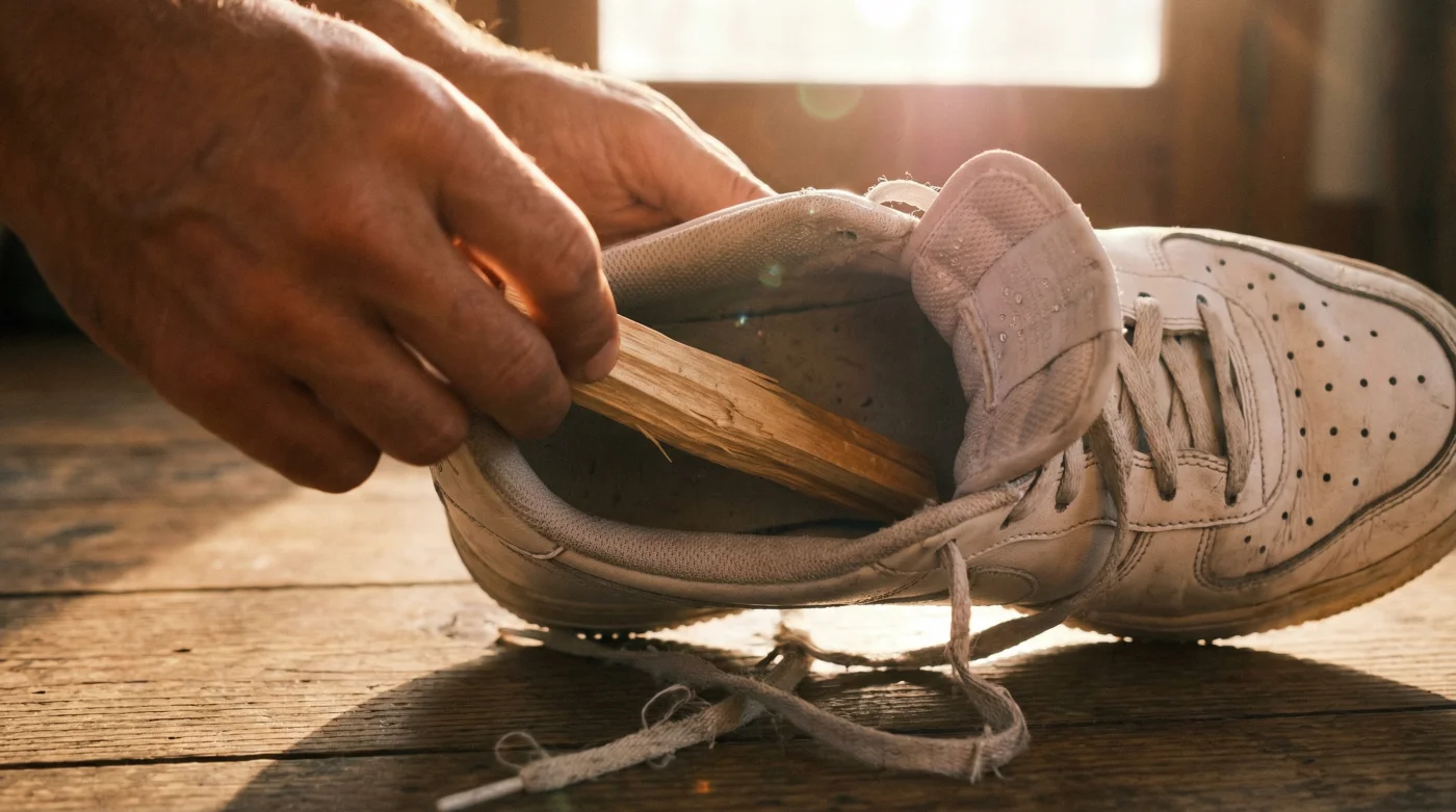 Take two dense, unburned Palo Santo wood sticks (weighing roughly 10 grams each) and slide them deep into the toe box of each shoe. Ensure the wood is resting directly against the dampest area of the interior fabric. Leave them completely undisturbed for a minimum of 12 hours, ideally overnight in a dry room hovering around 70 degrees Fahrenheit.
